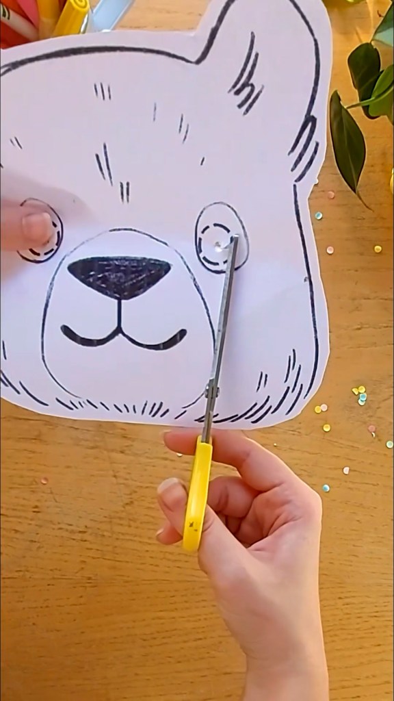 Una volta tagliate prendiamo una matita appuntita per fare dei buchi dove stanno gli occhi, così potremo inserire le forbici e fare i buchi dai quali guarderemo!