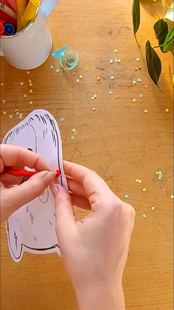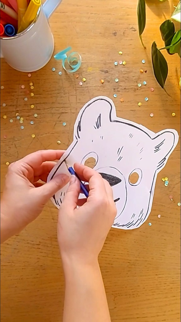 Sempre con la matita facciamo due buchi anche ai lati, da ognuno di questi buchi faremo passare u nastro a cui faremo un nodo per fissarlo alla carta. Una volta fissati i nastri potremo utilizzarli per indossare la maschera legandoli dietro la testa!